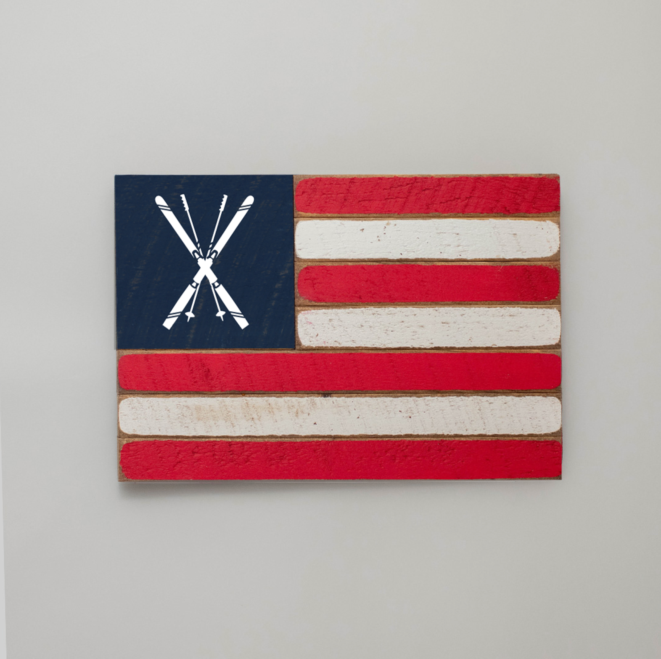 Crafted from high-quality wood, this twine sign features a detailed depiction of crossed skis set against the iconic American flag. The durable construction ensures it will remain a cherished part of your decor for years to come. Easy to hang, this versatile piece complements various styles, from modern to traditional. Whether you're looking to enhance your ski lodge or bring a bit of the slopes into your home, this wooden flag is a perfect choice.