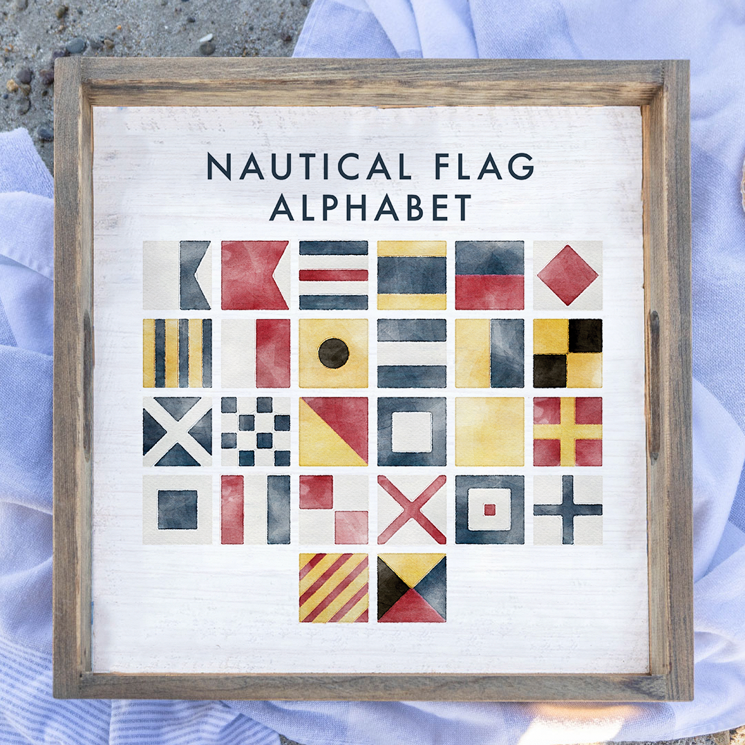 Crafted with a sturdy wooden frame, this serving tray features a vibrant nautical flag alphabet, offering both style and durability. The easy-to-clean surface ensures hassle-free maintenance, while the comfortable handles provide a secure grip. Whether you're hosting a beach-themed party or simply enjoying a quiet evening at home, this tray is a versatile addition to your kitchen or living room. Keywords: nautical decor, serving tray, coastal theme, maritime charm, wooden frame, nautical flag, twine sign, beach-themed party.
