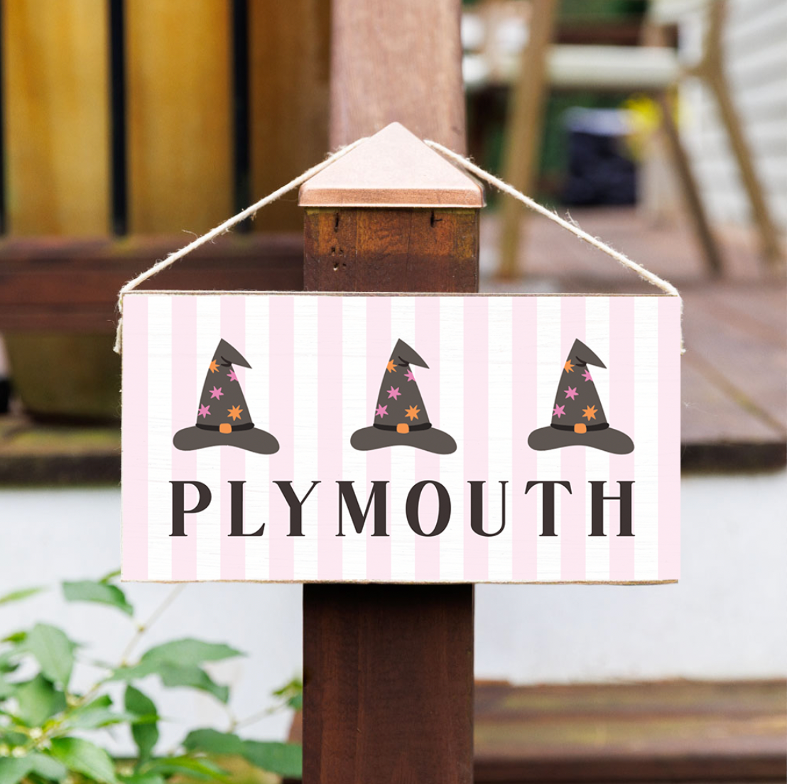 Crafted with care, the sign features three charming witch hats adorned with colorful stars, set against a subtle striped background. The durable twine hanger ensures easy installation, while the high-quality materials promise longevity. This personalized twine sign is a delightful way to enhance your seasonal decor, making it a must-have for those who love to celebrate in style. Perfect for front doors, porches, or indoor spaces, it’s a versatile piece that brings joy to any setting.
