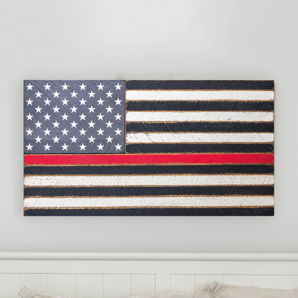 Honor the bravery and dedication of firefighters with this Thin Red Line American Flag twine sign. Perfect for your home or office, this piece serves as a meaningful tribute to those who protect and serve. Its striking design adds a touch of patriotism to any space, making it an ideal gift for first responders or anyone who values courage and commitment.