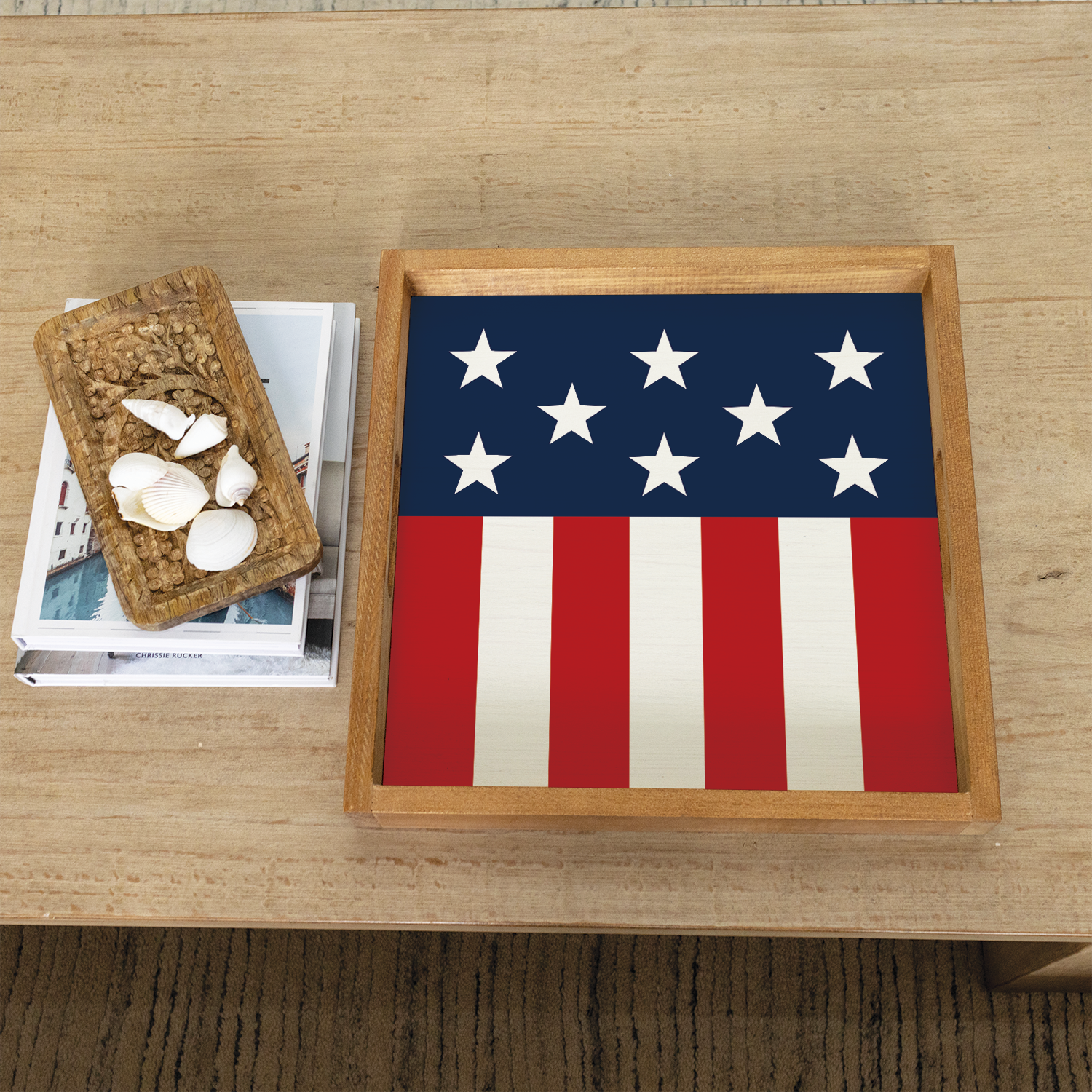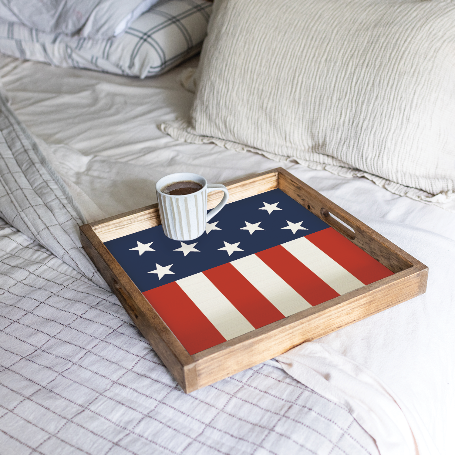 Crafted with care, this serving tray showcases a beautifully framed twine sign, adding a unique decorative element to your home. The natural wood finish enhances its timeless appeal, while the bold stars and stripes design captures the essence of American pride. Whether used for entertaining guests or as a decorative accent, this tray is a must-have for those who appreciate quality craftsmanship and classic design. Perfect for Fourth of July celebrations or everyday use, it’s a versatile addition to your home decor collection.