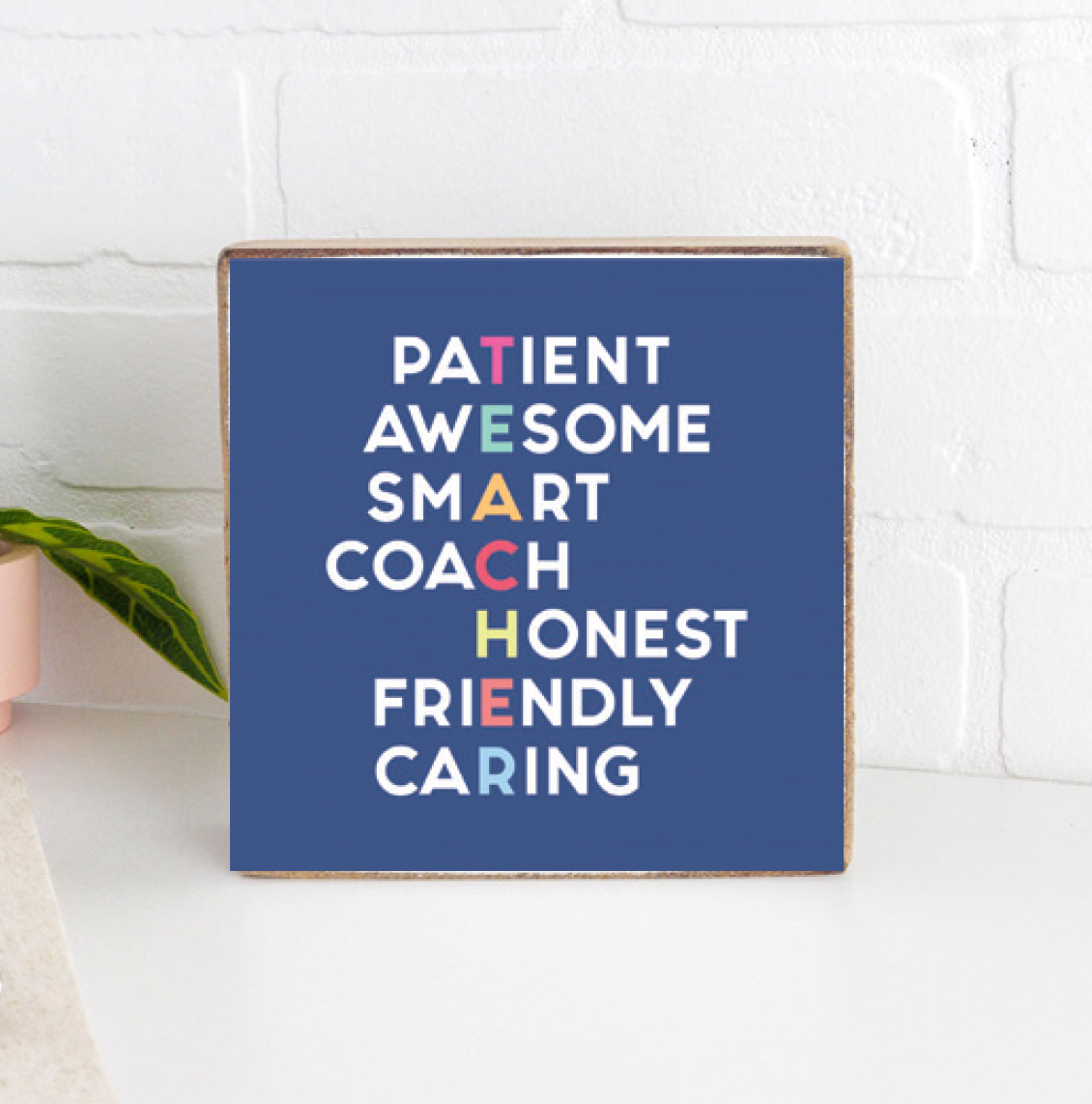 Crafted from durable wood, this twine sign features a vibrant design with bold, colorful letters that stand out against a deep blue background. The words "Patient," "Awesome," "Smart," "Coach," "Honest," "Friendly," and "Caring" are creatively arranged to spell "TEACHER," making it a meaningful addition to any educational space. Easy to hang or display, this piece is a delightful way to honor the dedication and passion of teachers everywhere.